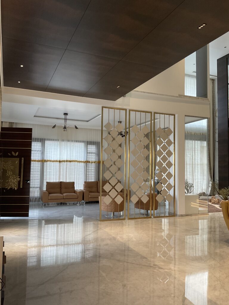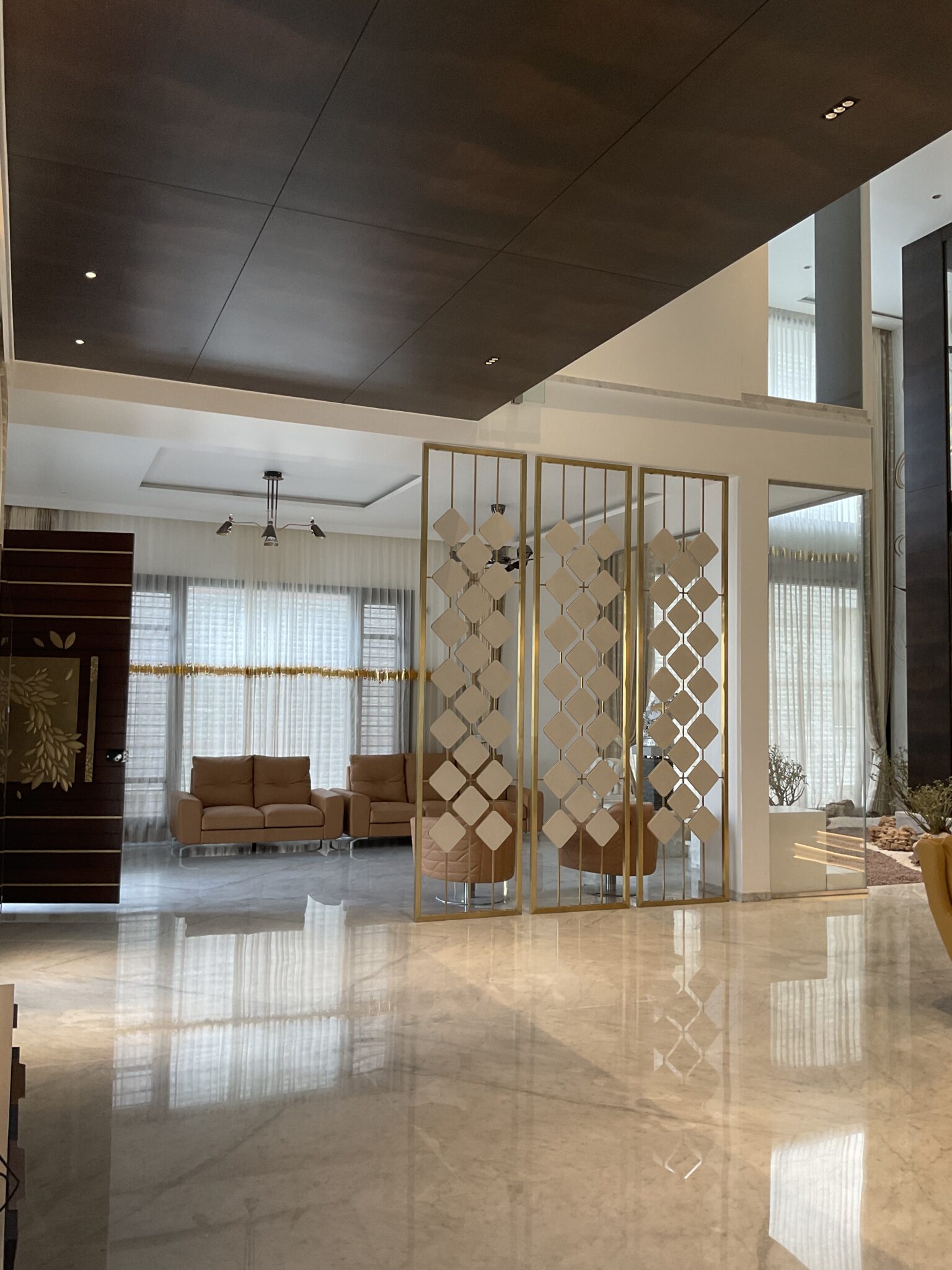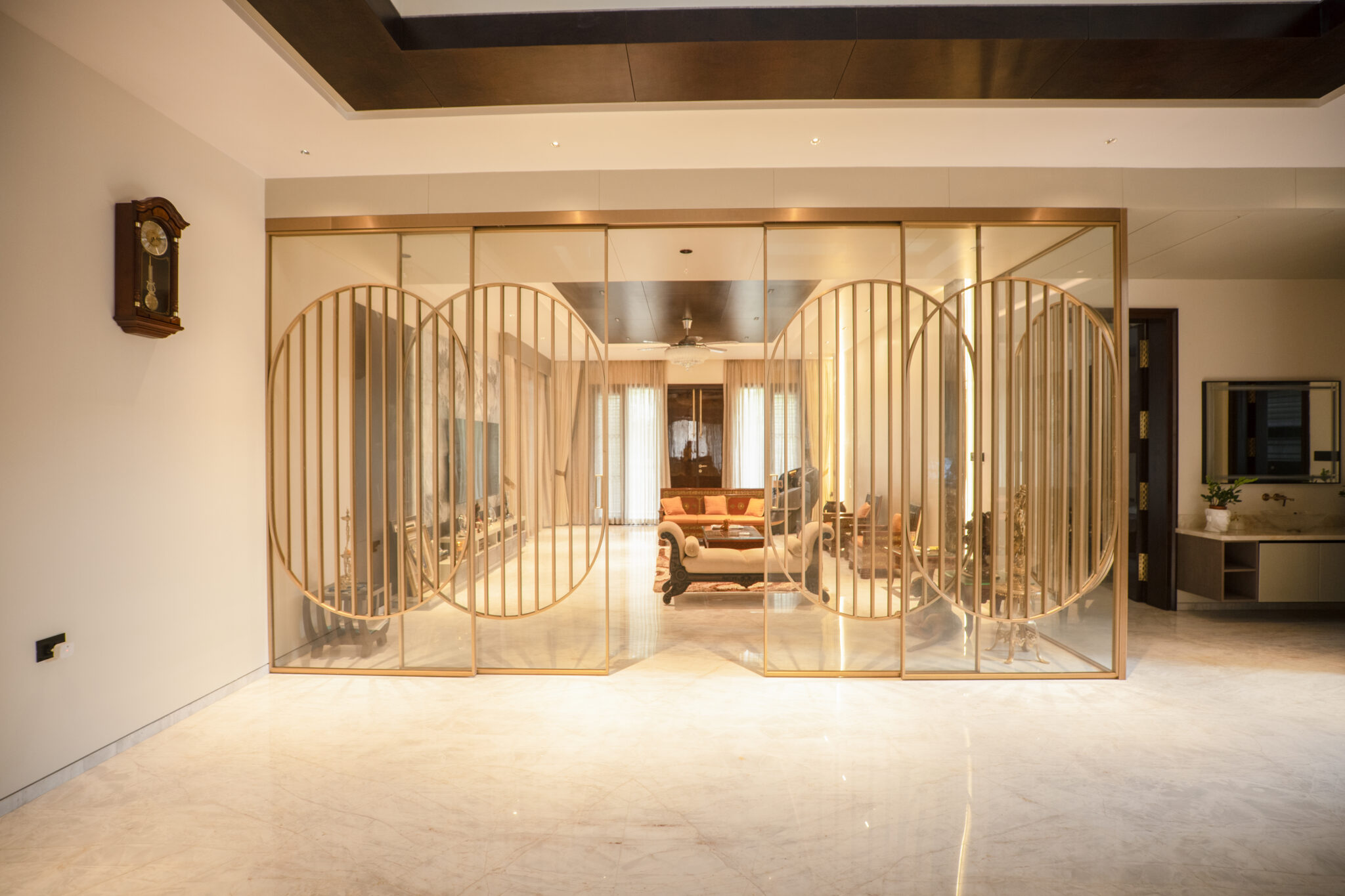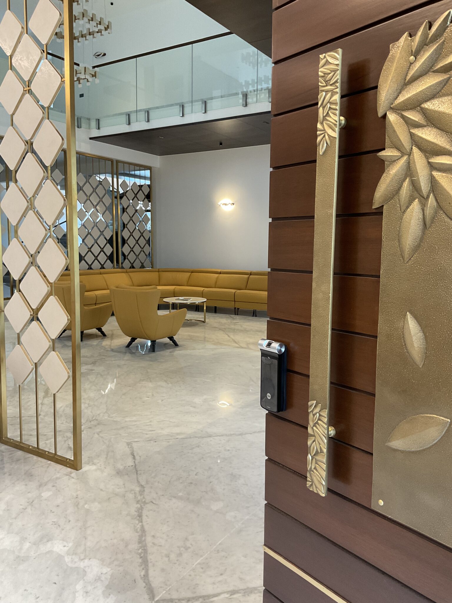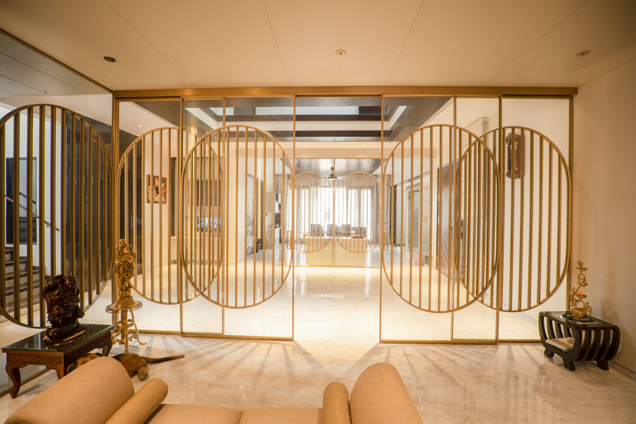 A warm lounge area accented with golden patterned shutters that blur the line between partition and art, adding elegance and softness to the open space.
