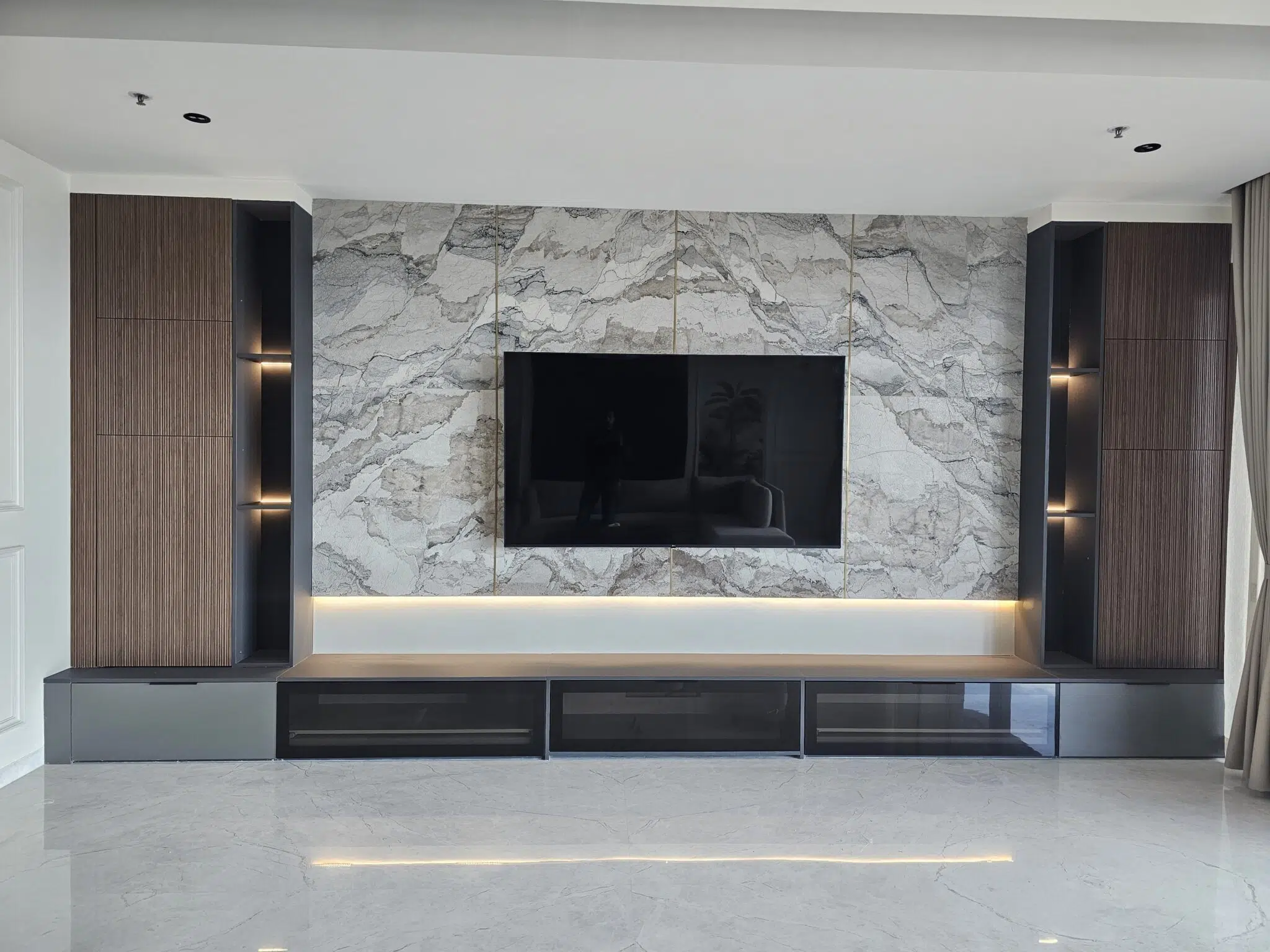 Contemporary TV unit featuring a marble-clad backdrop with a sleek black frame. The base comprises lacquered glass drawers with concealed lighting below, while fluted wooden panels on either side add warmth and texture.