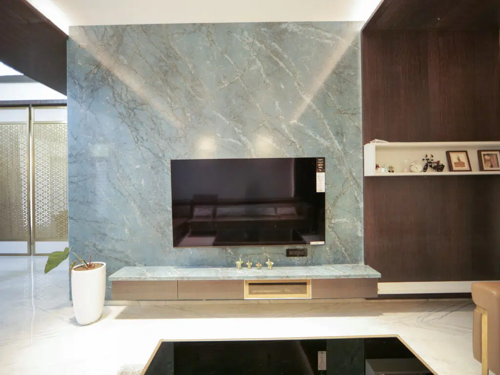 TV unit set against a striking green-veined marble backdrop, complemented by a floating wooden console with a central brass-accented niche. The design is balanced with open shelving on the right and subtle décor, creating a modern and earthy focal point in the living space.