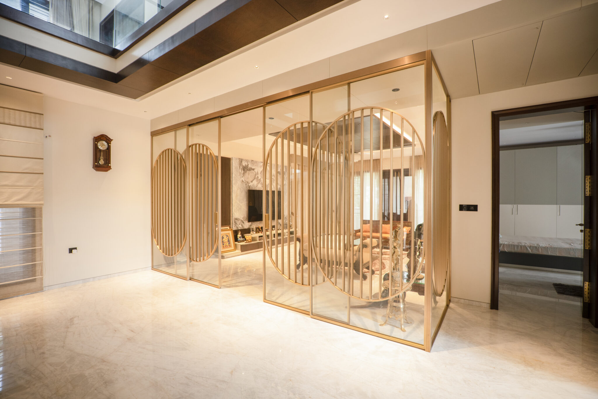 A sculptural metal partition in champagne gold defines the space with elegance. Its circular and vertical lines create a dreamy rhythm, casting soft shadows that shift with the light.