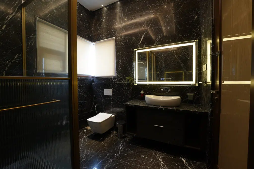 This wall-mounted double vanity features lacquered glass drawers paired with a rich stone countertop for a sleek, contemporary look. With twin vessel sinks, open side shelves, and a large backlit mirror, it offers both refined style and everyday functionality.