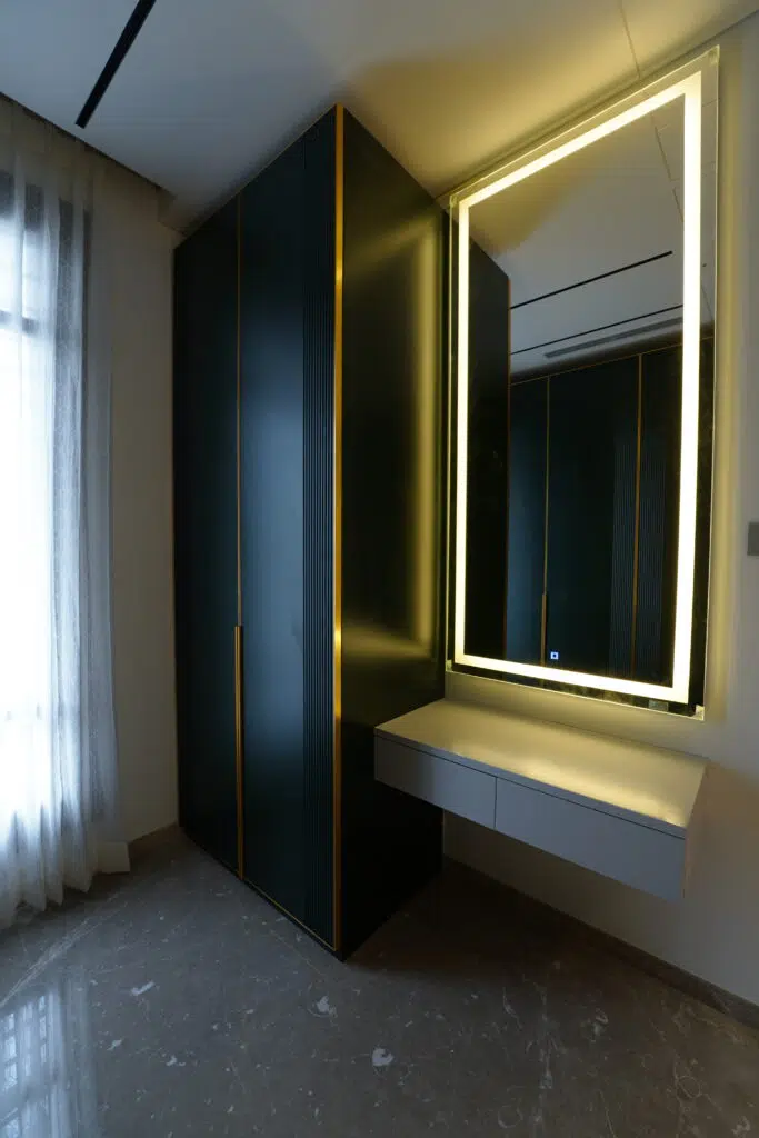 This floating vanity features a smooth PU finish with subtle panel detailing, complemented by a backlit mirror that adds depth and glow. The integrated bench-style seating and contrasting vertical wall cladding in black create a balanced, modern aesthetic which is perfect for a polished dressing nook.
