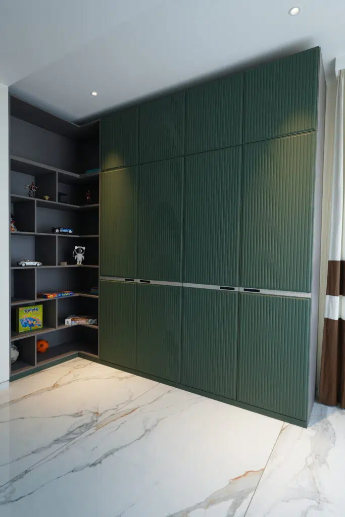 Finished in premium Leather and designed with a hinged opening system, this wardrobe offers seamless accessibility and smart storage planning. The textured panel detailing enhances its visual appeal, while the well-structured interiors provide maximum functionality with a clean, modern aesthetic.