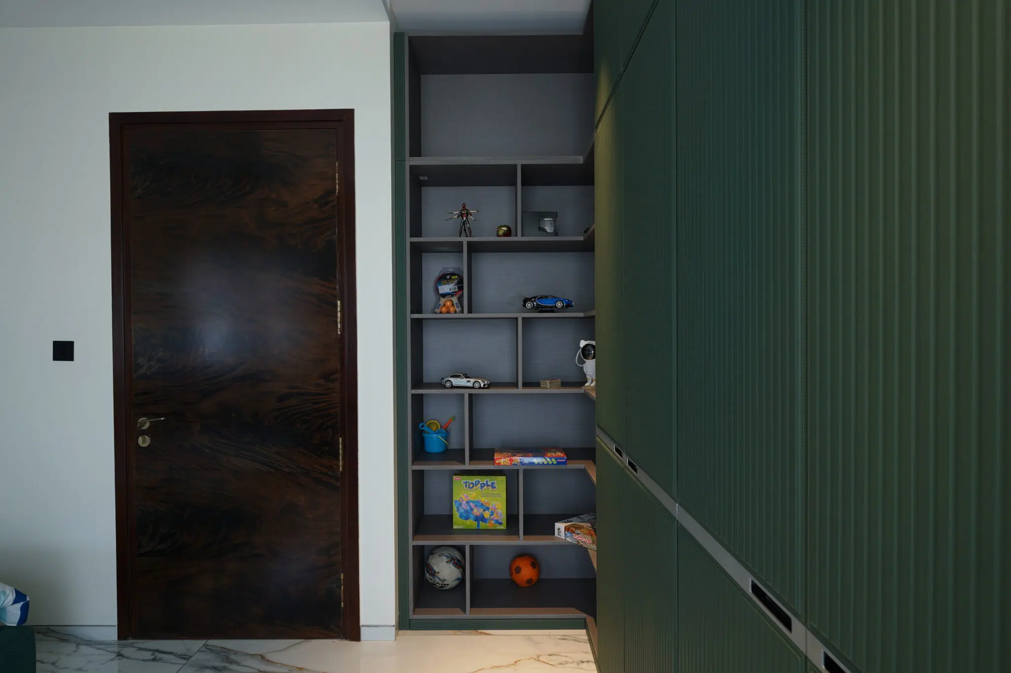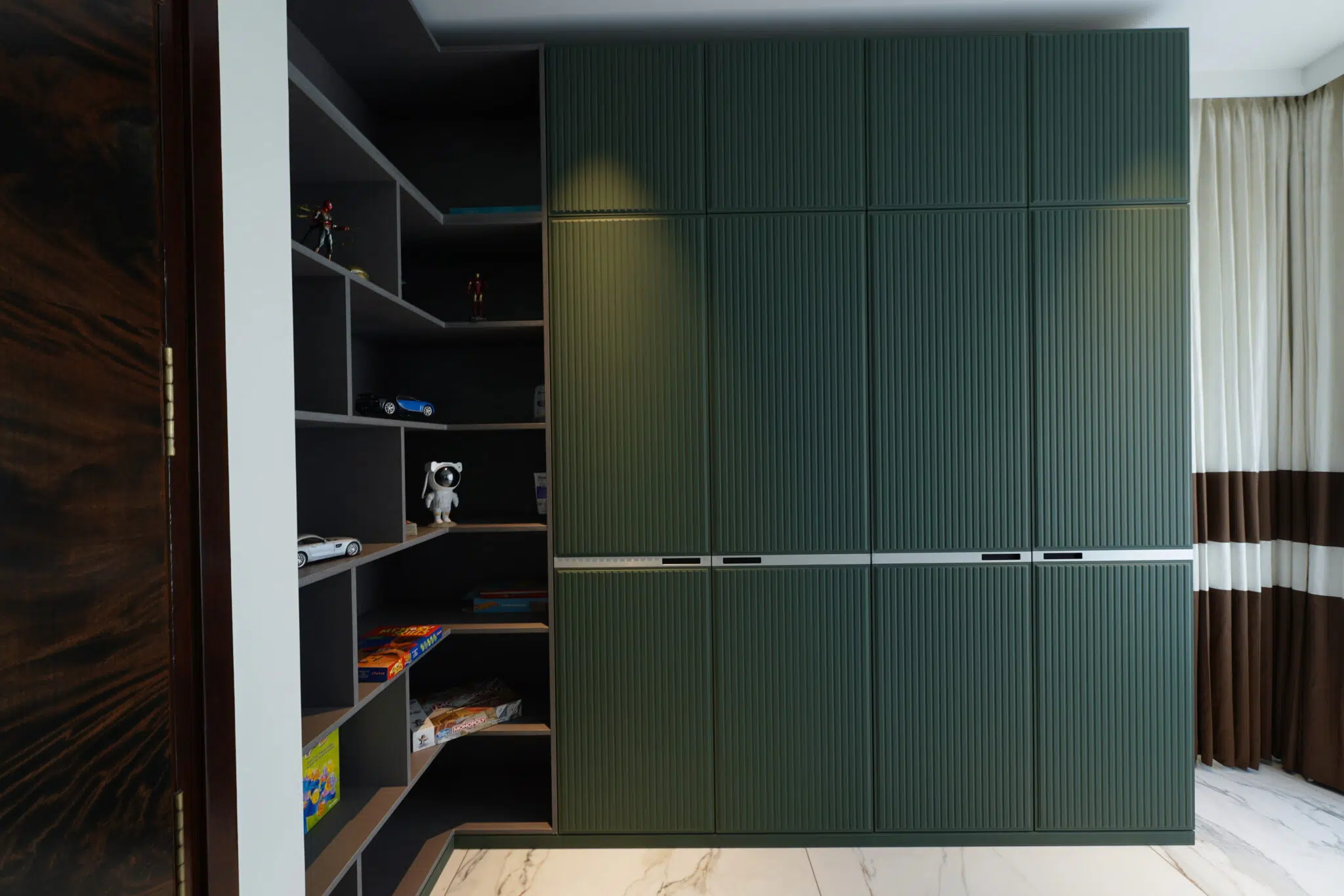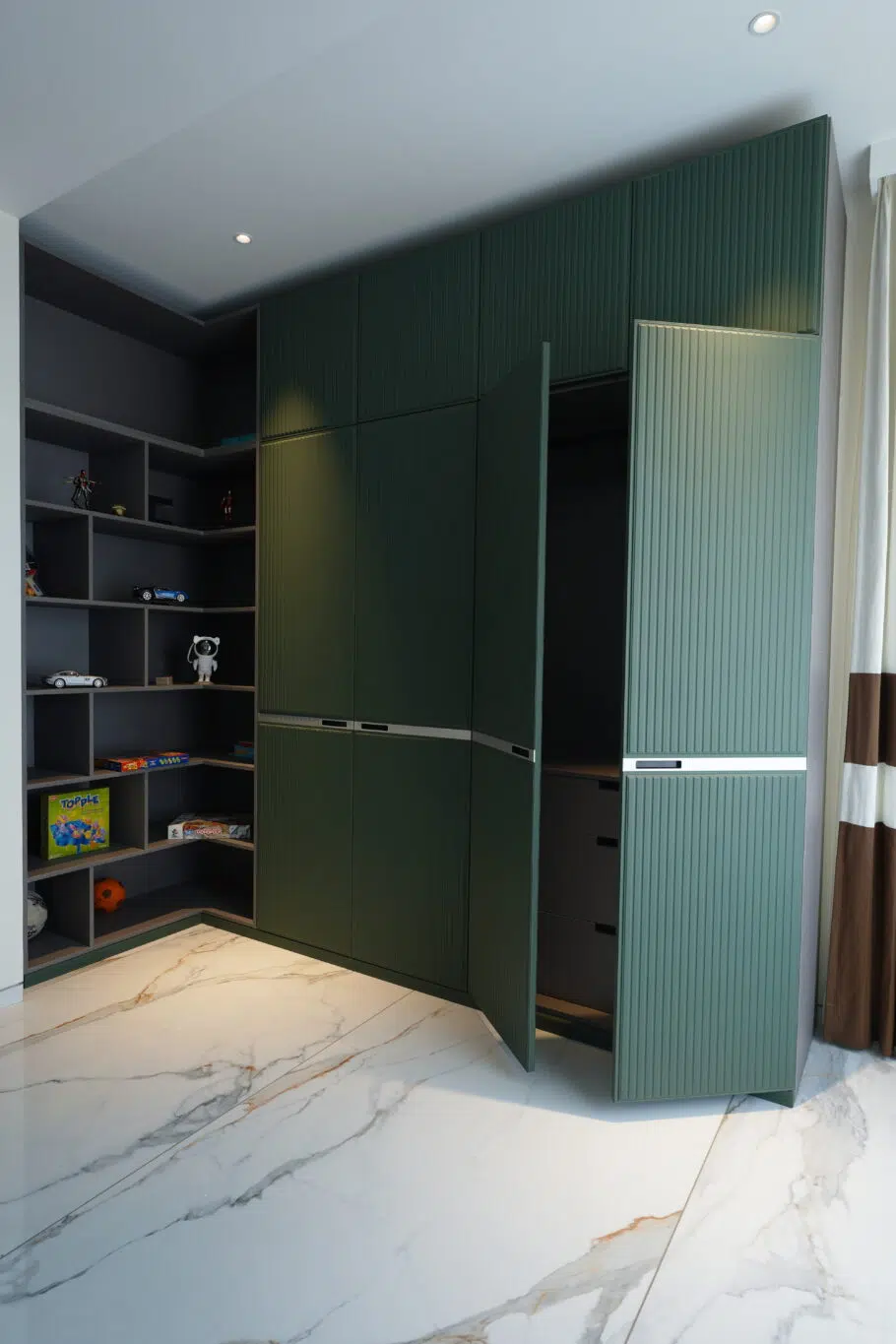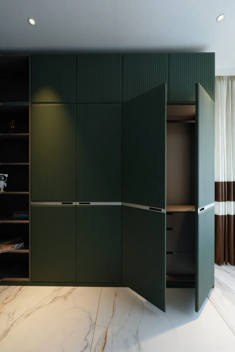 Finished in premium Leather and designed with a hinged opening system, this wardrobe offers seamless accessibility and smart storage planning. The textured panel detailing enhances its visual appeal, while the well-structured interiors provide maximum functionality with a clean, modern aesthetic.